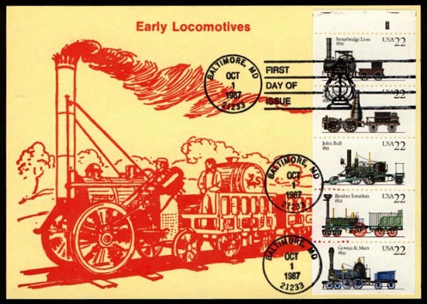 Sc. 2366a Locomotives booklet on a 5"x7" red-on-buff Dragon Card, showing the John Bull locomotive, First Day of Issue hand cancel. One of the few FDCs for this issue where the full pane is affixed rightside-up! (There are two different types of top tabs on these full panes. Ask if if it makes a difference which type you get.) **clearance**. Great for a Railroads Booklets-on-stamps collection!