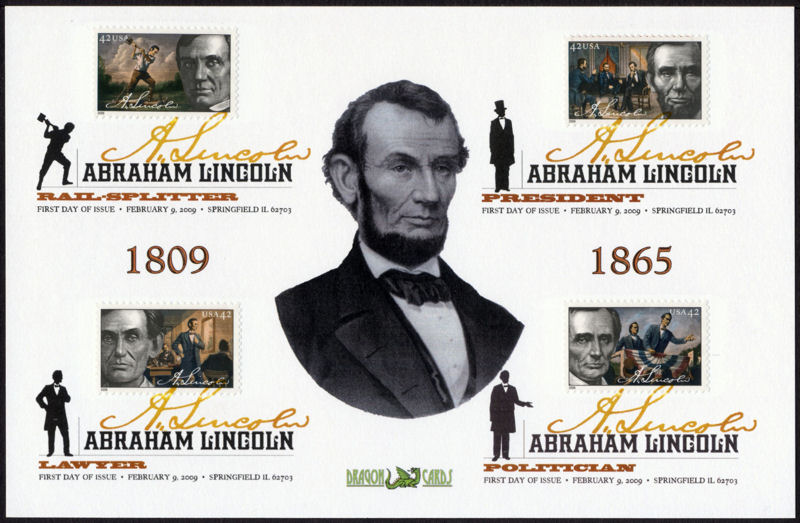 | Dgn 325a: Sc. 4380-3 Abraham Lincoln 5½"x8½" Dragon Card with a photo of Lincoln from 1865. All 4 stamps, each tied with the First Day of Issue hand cancel larger illustration (new window). | | |