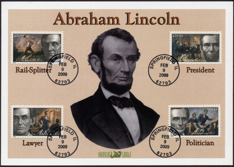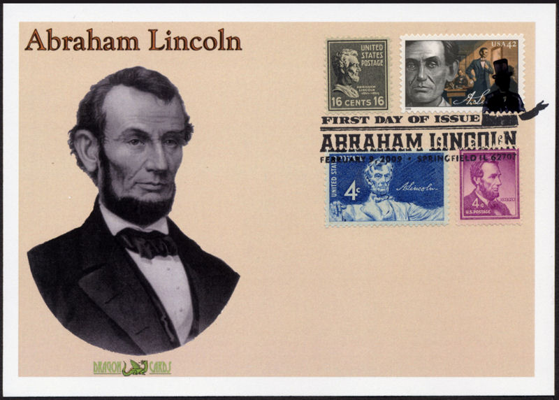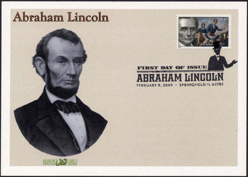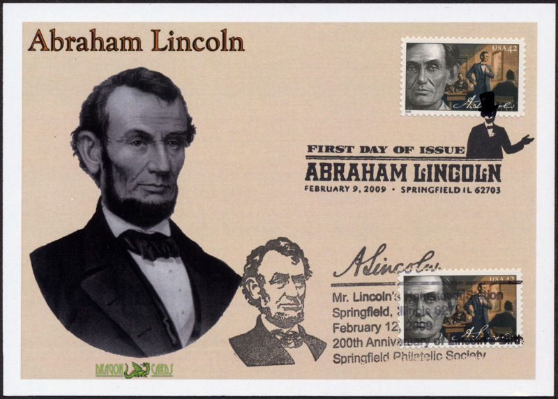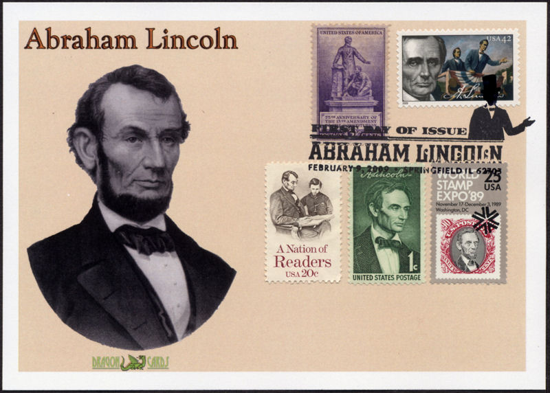 | Dgn 324g: Sc. 4381 Abraham Lincoln 5"x7" Dragon Card with a photo of Lincoln published by "Chr. Kimmel & Forster" in 1865, with 2 copies of the Lawyer stamp: One tied by the First Day of Issue hand cancel, the other by the Feb. 12 Springfield (IL) Philatelic Society pictorial larger illustration (new window). | | |