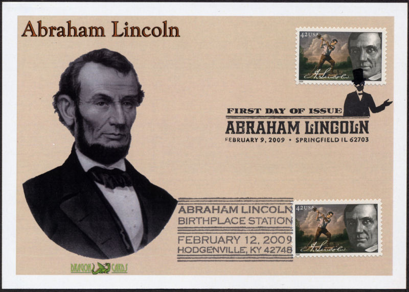 | Dgn 324f: Sc. 4380 Abraham Lincoln 5"x7" Dragon Card with a photo of Lincoln published by "Chr. Kimmel & Forster" in 1865, with 2 copies of the Rail-Splitter stamp: One tied by the First Day of Issue hand cancel, the other by the Hodgenville, KY, February 12 Birthplace Station postmark larger illustration (new window). | | |