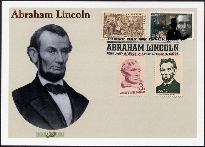 | Dgn 324h: Sc. 4382 Abraham Lincoln 5"x7" Dragon Card with a photo of Lincoln published by "Chr. Kimmel & Forster" in 1865, with 2 copies of the Politician stamp: One tied by the First Day of Issue hand cancel, the other by the Feb. 12 Washington DC Abraham Lincoln Bicentennial Station pictorial larger illustration (new window). | | |