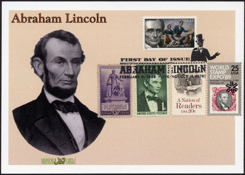 | Dgn 324bb: Sc. 4382 Abraham Lincoln 5"x7" Dragon Card with a photo of Lincoln published by "Chr. Kimmel & Forster" in 1865, with earlier Lincoln stamps Sc. 902 13th Amendment, Sc. 1113 Sesquicentennial, Sc. 2106 Nation of Readers, Sc. 2410 World Stamp Expo. First Day of Issue hand cancel. Different configuration larger illustration (new window). | | |