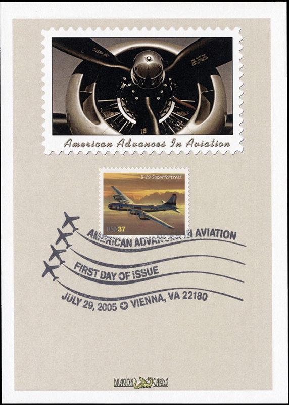 3916-25 Aviation on a set of 10 5"x7" Dragon Cards, all same design: A faux stamp with a closeup of a propeller. Vienna, Va., First Day of Issue hand cancel. Great for an aviation- or airplanes-on-stamps collection! |
