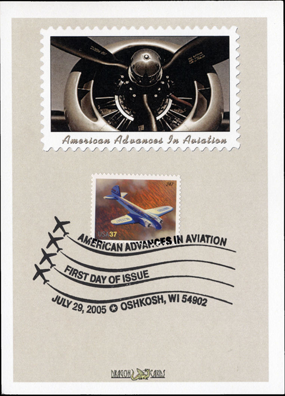 3916 Aviation 247 single on a 5"x7" Dragon Card, faux stamp design featuring a propeller. Vienna, Va., First Day of Issue hand cancel. Great for an aviation- or airplanes-on-stamps collection! |