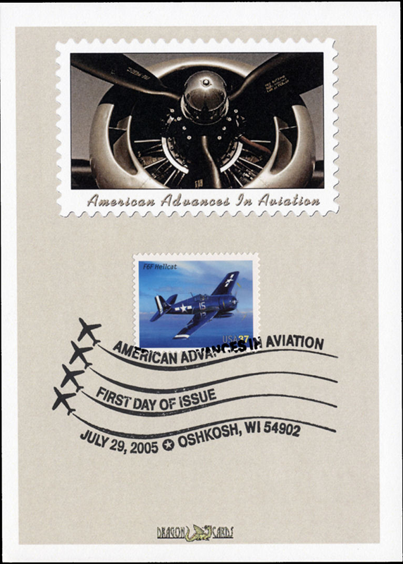 ![]() | ![]() First Day Cover Aviation Dgn 201g $3.00 Sc. 3918 Aviation F6F Hellcat single on a 5"x7" Dragon Card, faux stamp design featuring a propeller. Vienna, Va., First Day of Issue hand cancel. Great for an aviation- or airplanes-on-stamps collection! |