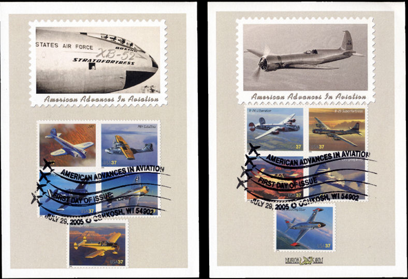 Sc. 3916-25 Aviation on a set of 2 Dragon Cards, 5 stamps each. One faux stamp in the design features the XB-52 Stratofortress, the other the Hughes H-1 Racer, both of which were featured in the sheet's selvage. Oshkosh, Wis., First Day of Issue hand cancel. Great for an aviation- or airplanes-on-stamps collection!