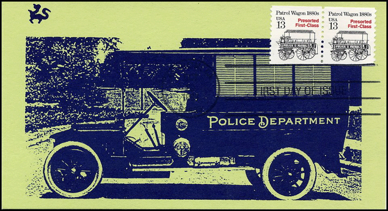 Sc. 2258 13¢ Police Wagon coil pair on a FDC-size Dragon Card, blue printed photo on green. First Day of Issue hand cancel. Great for a law enforcement- or transportation-on-stamps collection! Back To