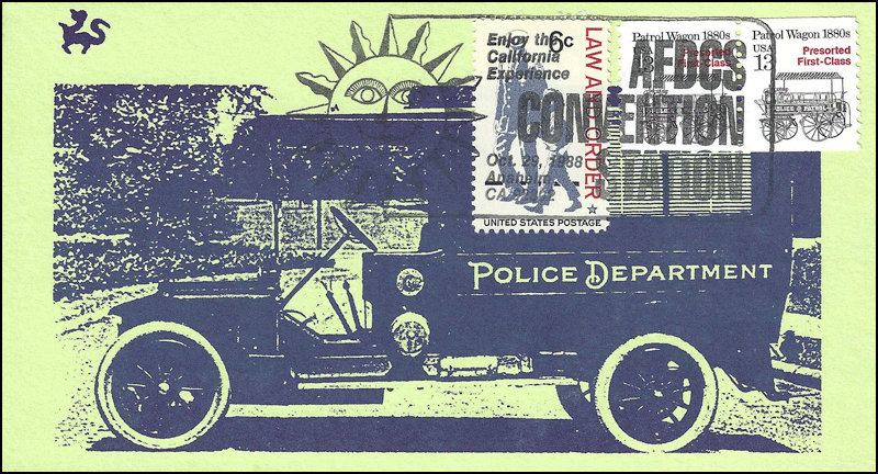 Sc. 2258 13¢ Police Wagon coil pair on a FDC-size Dragon Card, blue printed photo on green. AFDCS Convention Anaheim semi-official hand cancel ties the new stamp and Sc. 1343 Law & Order. Great for a law enforcement- or transportation-on-stamps collection!