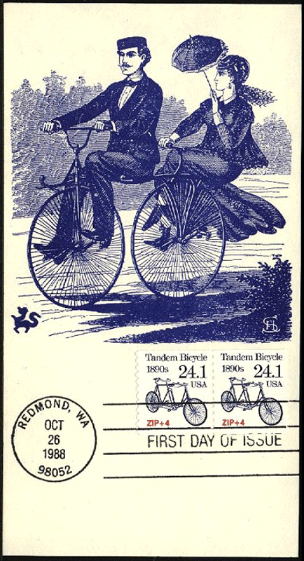 ![]() First Day Cover 24.1¢ Tandem Bicycle coil Dgn 23 $2.50 Sc. 2266 24.1¢ Tandem Bicycle coil on a pair on a FDC-size blue-on-buff Dragon Card, vertical format. First Day of issue hand cancel. Great for a transportation-, sports-, recreation- or bicycles-on-stamps collection! |