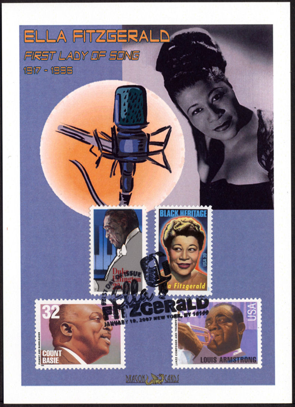 ![]() | ![]() First Day Cover Ella Fitzgerald Dgn 249c $5.00 Sc. 4120 Ella Fitzgerald on a 5"x7" Dragon Card showing a photo of Fitzgerald and art of a microphone. First Day of Issue pictorial hand cancel ties other black jazz musicians: Sc. 2211 Ellington, 2982 Armstrong, 3096 Basie. Great for a music-, jazz- or Black History-on-stamps collection! |