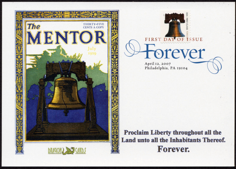 Sc. 4127 Forever Stamp on a 5"x7" Dragon Card showing a 1929 magazine cover with a picture of the Liberty Bell. Digital color postmark. Great for a Liberty Bell- or Americana-on-stamps collection!