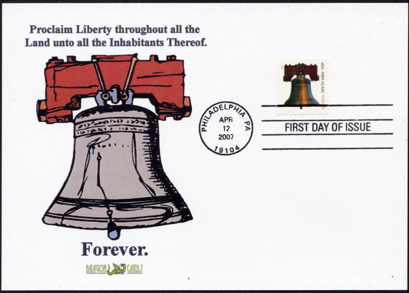 Sc. 4127 Forever Stamp on a 5"x7" Dragon Card showing art of the Liberty Bell. First Day of Issue hand cancel. Great for a Liberty Bell- or Americana-on-stamps collection!