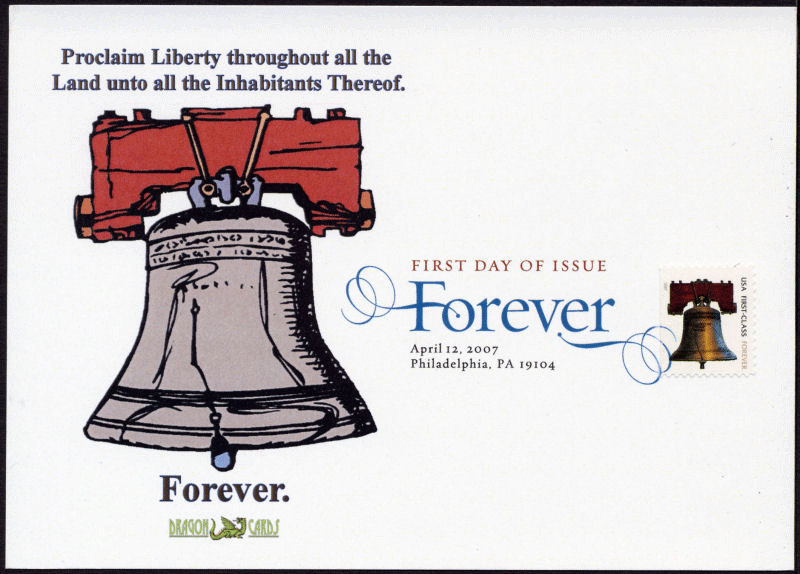 Sc. 4127 Forever Stamp on a 5"x7" Dragon Card showing art of the Liberty Bell. Digital color postmark. Great for a Liberty Bell- or Americana-on-stamps collection!