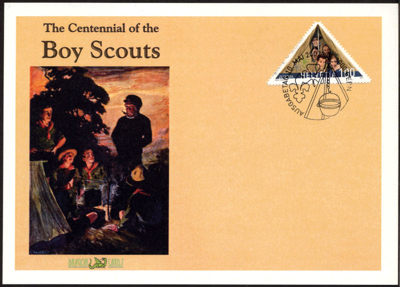 Sc. 1268 Switzerland Scouting Centennial on a 5"x7" Dragon Card showing art of Boy Scouts around a campfire with a pipe-smoking adult. With Switzerland's first day cancel. Great for a scouting-on-stamps collection!