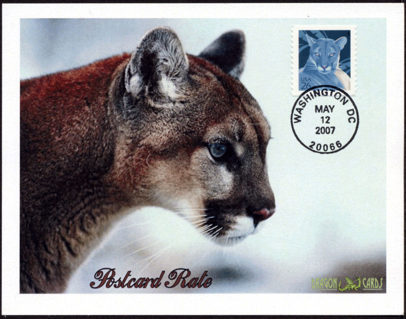 Sc. 4141 Florida Panther coil single on a 4¼"x 5½" Dragon Card (which met the requirements for a postcard) with a closeup photo of a Florida panther. Circular date stamp (first day). Great for a cats- or wildlife-on-stamps collection!