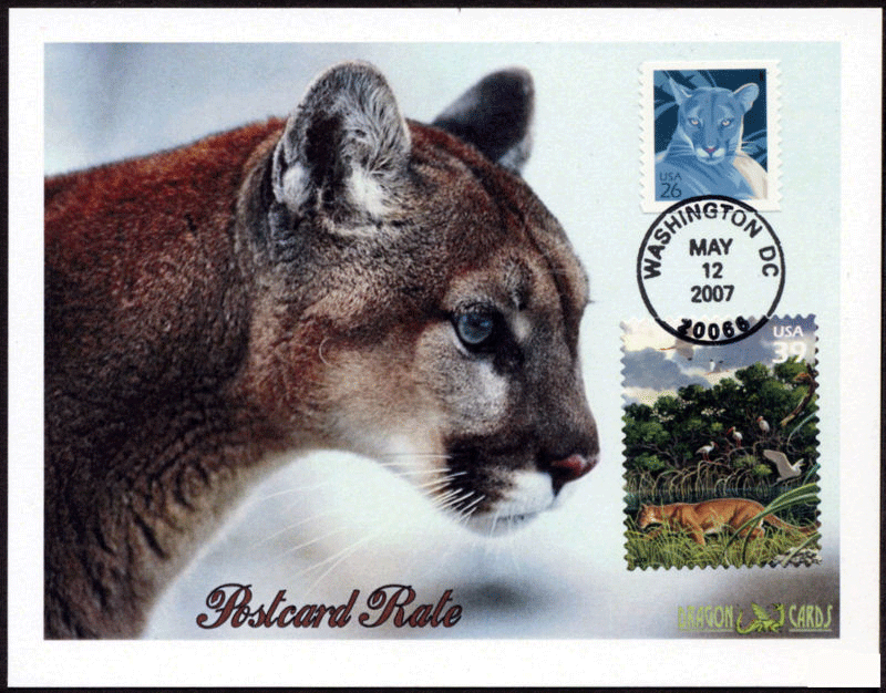 Sc. 4141 Florida Panther coil single on a 4¼"x5½" Dragon Card with a closeup photo of a Florida panther. With Sc. 4099c Florida panther from the 2006 Florida Wetlands sheet. Circular date stamp (first day). Great for a cats- or wildlife-on-stamps collection!