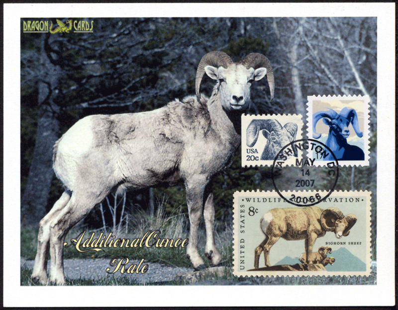 Sc. 4138 Big Horn Sheep on a 4¼"x5½" Dragon Card showing a photograph of a Big-Horn Sheep. With two earlier Big Horn Sheep stamps, Sc. 1467 and 1949. First-day circular date stamp hand cancel. Great for a sheep- or animals-on-stamps collection!