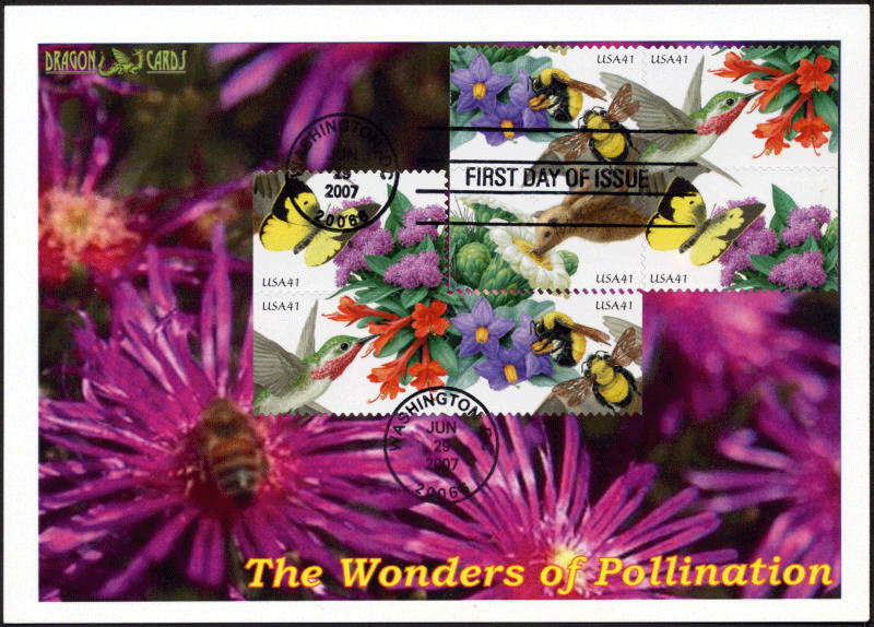 Sc. 4153-6 Pollination on a 5"x7" card showing a bee pollinating purple flowers. Block of four plus three more stamps to show the interlocking design. First Day of Issue hand cancel. Great for a birds-, insects-, animals-, or flowers-on-stamps collection!