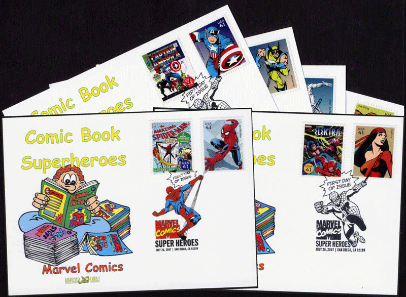 Sc. 4159 Marvel Comics on a Set of 10 5"x7" Dragon Card with color art of a young man reading a comic book. Each card has two stamps, the character and matching cover. Nine have the First Day of Issue hand cancel; Spider-Man has the Digital Color Postmark. Great for a comics-, literature- or entertainment-on-stamps collection!