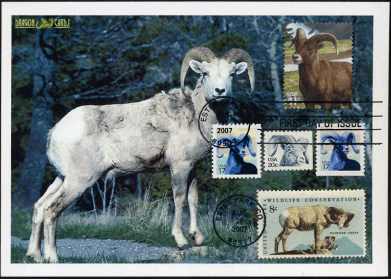 Sc. 4198e Alpine Tundra/Bighorn Sheep on a 5"x7" Dragon Card showing a photograph of a Big-Horn Sheep. With earlier Big-Horn Sheep stamps: 2007's 4138 and 4140, Sc. 1467 from the 1972 Wildlife Conservation block of four, and Sc. 1949 booklet single from 1982. First Day of Issue hand cancel. Great for a sheep- or animals-on-stamps collection!