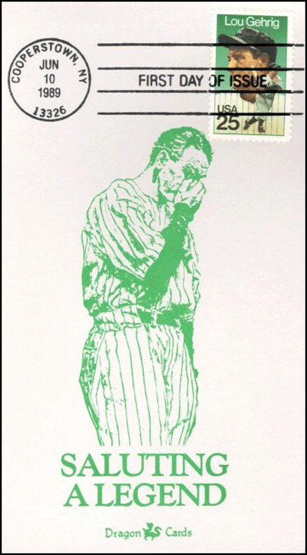 ![]() First Day Cover Lou Gehrig Dgn 28 $2.50 Sc. 2417 Lou Gehrig on a green-on-gray vertical FDC-size Dragon Card. The printed drawing shows Gehrig overcome by emotion on July 4, 1939, when he gave his "Luckiest Man on the Face of the Earth" speech. First Day of issue hand cancel. Great for a baseball- or sports-on-stamps collection! |