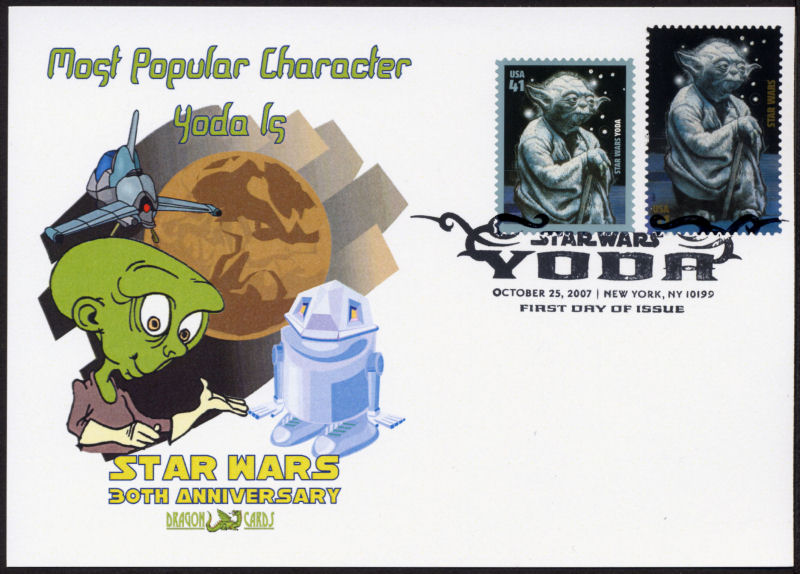 Sc. 4205 Yoda - Star Wars on a 5"x7" Dragon Card showing a planet, a robot, fighter starship and a kindly-looking green alien. With the earlier Yoda stamp from the Star Wars set (Sc. 4143n). First Day of Issue hand cancel. Great for a Star Wars-, movies- or entertainment-on-stamps collection!