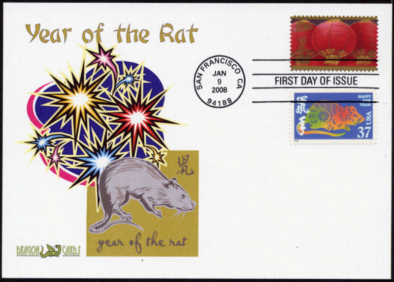 Sc. 4221 Year of the Rat on a 5"x7" Dragon Card showing a Year of the Rat icon and fireworks. U.S. First Day of Issue hand cancel ties new and earlier (Sc. 3895a) U.S. stamps. Great for a Lunar New Year- or holidays-on-stamps collection!