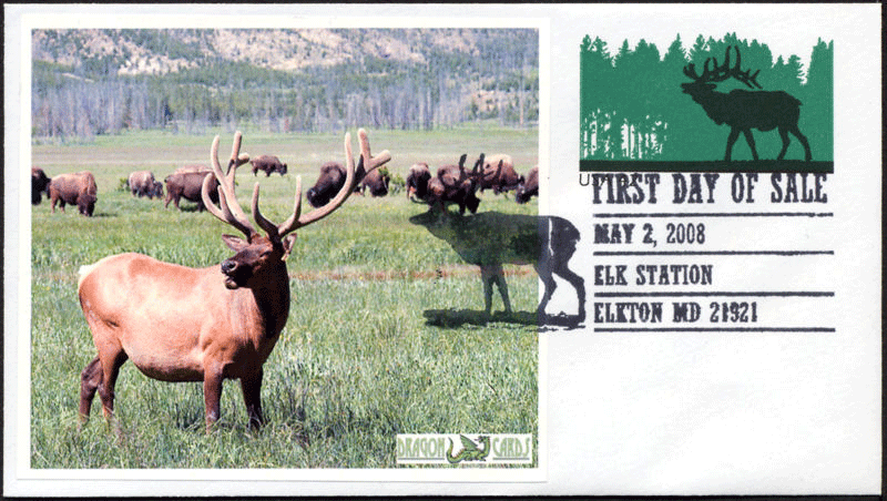 Sc. U663a Elk envelope MeadWestvaco version, with Dragon Cards label cachet showing elk in the summer, tied by the Elkton, MD, First Day of Sale hand cancel. Great for an animals-on-stamps collection!