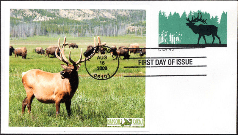 Sc. U663b Elk envelope offset lithography version, with Dragon Cards label cachet showing elk in the summer, tied by First Day of Issue hand cancel. Great for an animals-on-stamps collection!