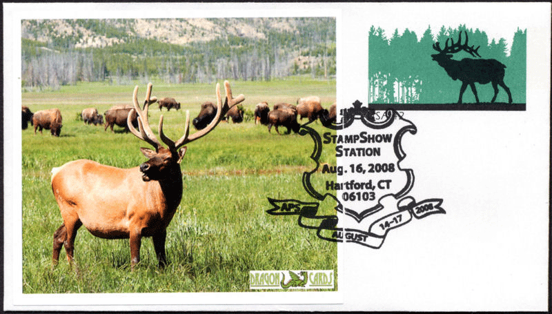 Sc. U663b Elk envelope offset lithography version, with Dragon Cards label cachet showing elk in the summer, tied by StampShow 2008 show cancel. Great for an animals-on-stamps collection!
