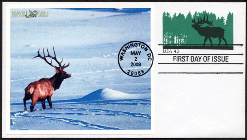 Sc. U663a Elk envelope MeadWestvaco version, with Dragon Cards label cachet showing elk in the winter, tied by First Day of Issue hand cancel. Great for an animals-on-stamps collection!