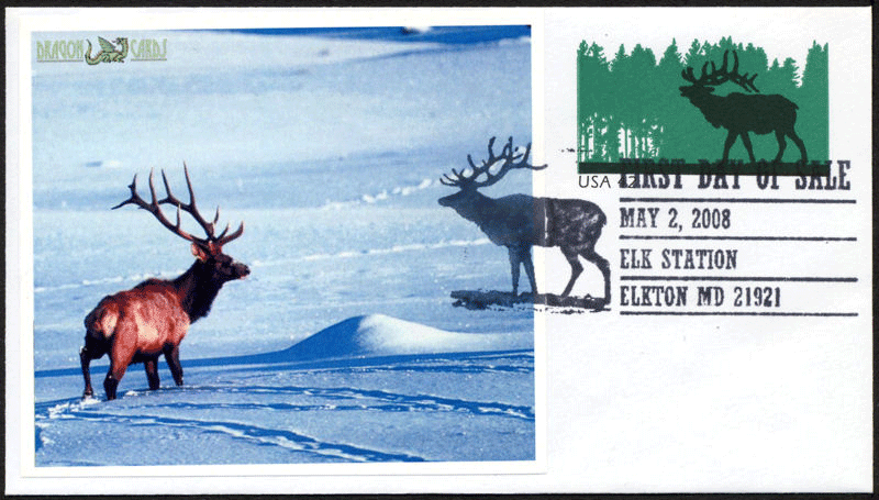 Sc. U663a Elk envelope MeadWestvaco version, with Dragon Cards label cachet showing elk in the winter, tied by the Elkton, MD, First Day of Sale hand cancel. Great for an animals-on-stamps collection!