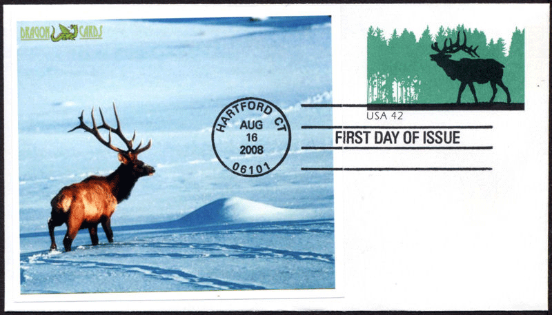 Sc. U663b Elk envelope offset lithography version, with Dragon Cards label cachet showing elk in the winter, tied by First Day of Issue hand cancel. Great for an animals-on-stamps collection!