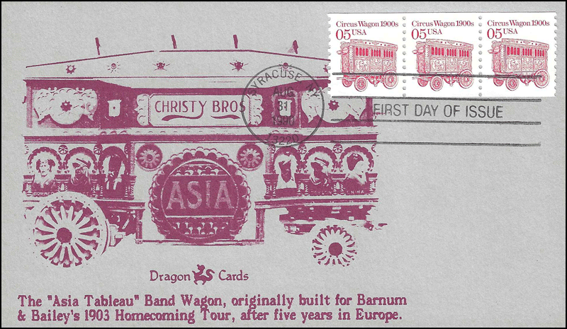 Sc. 2452 5¢ Circus Wagon coil on a maroon-on-gray FDC-size Dragon Card, showing the Asia Tableau Wagon. First Day of Issue hand cancel ties a strip of 3. Great for a circus-, entertainment- or transportation-on-stamps collection! Back To