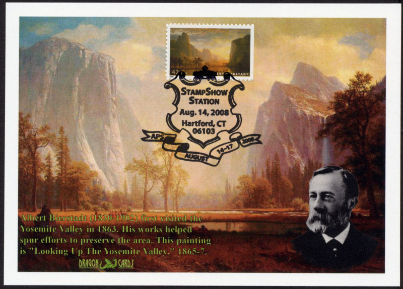 Sc. 4346 Bierstadt's Yosemite on a 5"x7" Dragon Card reproducing another Albert Bierstadt painting, "Looking Up The Yosemite Valley," painted a few years later than the work on the stamp. With the StampShow 2008 pictorial hand cancel — the stamp was issued at the show. Great for a national parks- or art-on-stamps collection!