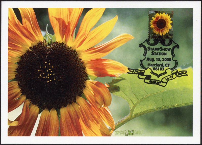 Sc. 4347 42¢ Sunflower on a 5"x7" Dragon Card reproducing a closeup photo of a sunflower. With the StampShow 2008 pictorial hand cancel - the stamp was issued at the show. Great for a flowers-on-stamps collection! Back To