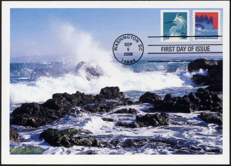 Sc. 4348 Seacoast coil on a 5"x7" Dragon Card showing a photo of a rocky seacoast. 37¢ Snowy Egret + Seacoast single. First Day of Issue hand cancel. Great for an oceans-on-stamps collection!