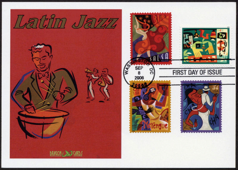 Sc. 4349 Latin Jazz on a 5"x7" Dragon Card featuring art of a Latin drummer, taken from a Tito Puente album. With Sc. 3939-41 Merengue, Salsa and Cha-Cha Latin Dances stamps, First Day of Issue hand cancel. Great for a music-, jazz- or Hispanic culture-on-stamps collection!
