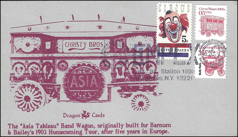 Sc. 2452 5¢ Circus Wagon coil on a maroon-on-gray FDC-size Dragon Card, showing the Asia Tableau Wagon. EMPEX show hand cancel ties a single plus Sc. 1309 Circus and Sc. 2261 Popcorn Wagon. Great for a circus-, entertainment- or transportation-on-stamps collection!