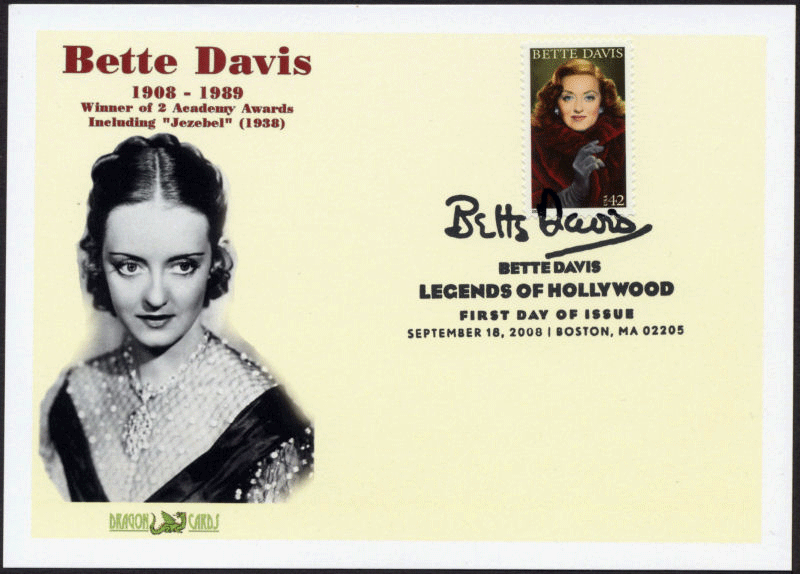 ![]() | ![]() First Day Cover Bette Davis Dgn 310 $2.50 Sc. 4350 Bette Davis on a 5"x7" Dragon Card with a photo of Davis in "Jezebel" (1938), for which she won an Academy Award. Great for a movies- or entertainment-on-stamps collection! |