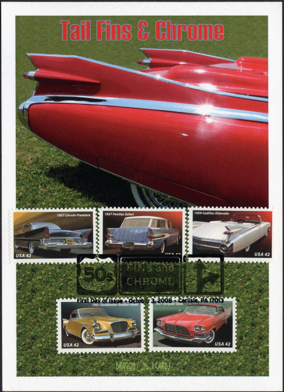 ![]() | ![]() First Day Cover Tail Fins & Chrome Dgn 312 $6.00 Sc. 4353-7 Tail Fins & Chrome on a 5"x7" Dragon Card with a picture of a red 1959 Cadillac Eldorado's tail fins. The 5 single stamps are tied by the First Day of Issue pictorial hand cancel. Great for an autos-on-stamps collection! |