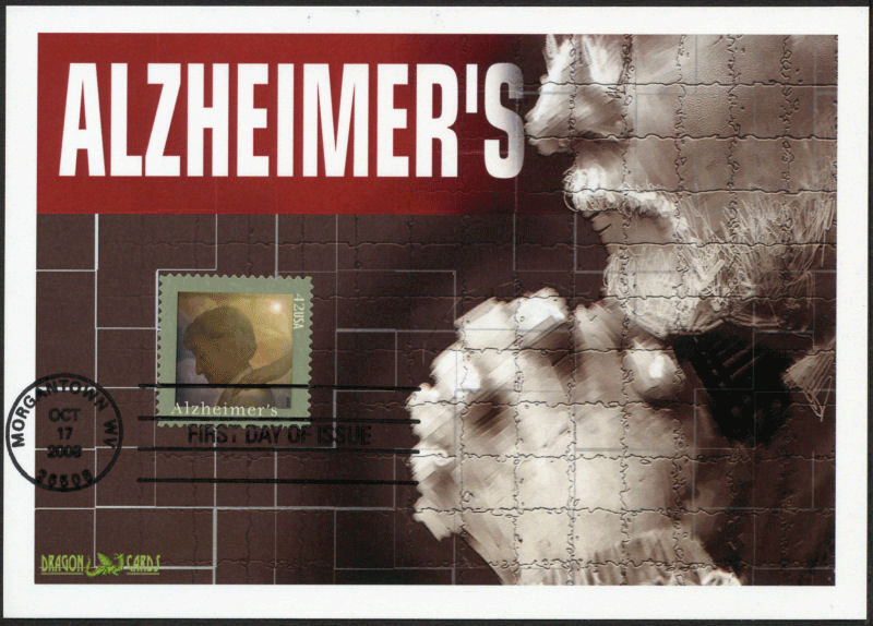 Sc. 4358 Alzheimer's Awareness on a 5"x7" Dragon Card with a graphic of an elderly man. First Day of Issue hand cancel. Great for a social issues-, health- or aging-on-stamps collection!