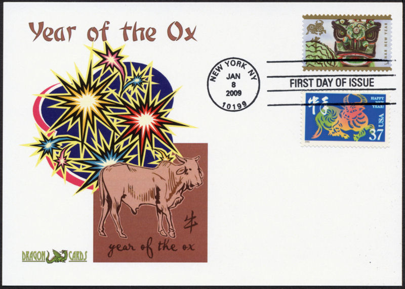 Sc. 4375 Year of the Ox on a 5"x7" Dragon Card showing a Year of the Ox icon and fireworks. First Day of Issue hand cancel ties new and earlier (Sc. 3895b) U.S. stamps. Great for a Lunar New Year- or holidays-on-stamps collection!