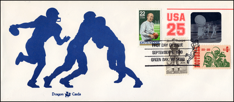 Sc. U618 Football envelope on a #10 envelope (only size for this issue) with a printed blue silhouette of 3 players, The FDOI hand cancel ties the envelope’s indicia, Sc. 1382 College Football, 2089 Jim Thorpe and 2376 Knute Rockne. Great for a sports- or football-on-stamps collection!