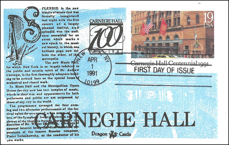 Sc. UX154 Carnegie Hall postal card with a two-color Dragon Cards cachet. The background is a Harper's magazine drawing of Opening Night; the foreground is a newspaper review and the Centennial logo. First Day of Issue hand cancel. Great for a music- or New York City-on-stamps collection!