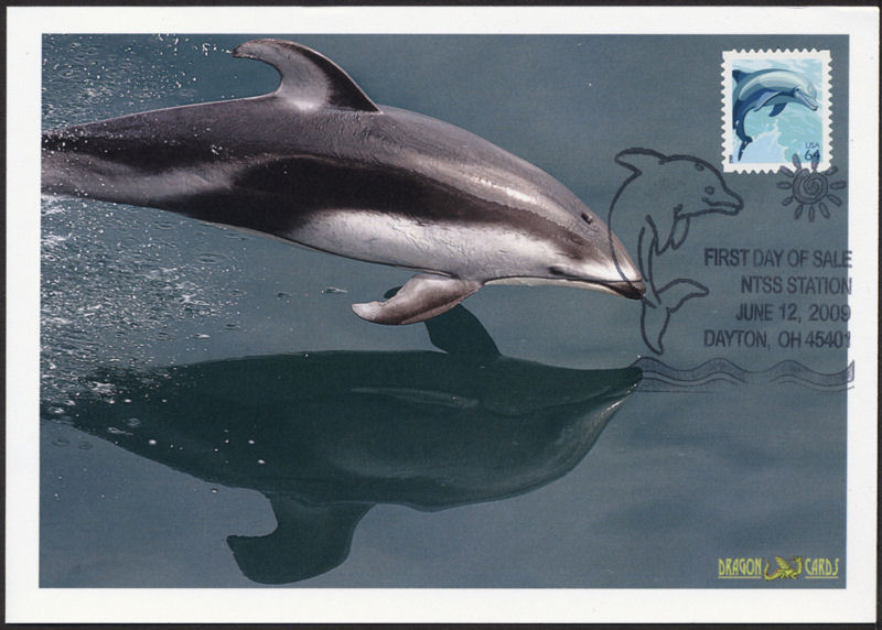 Sc. 4388 64¢ Dolphin on a 5"x7" Dragon Card featuring a photo of a dolphin leaping. National Topical Stamp Show First Day of Sale pictorial hand cancel showing a leaping dolphin. Great for a dolphins-, aquatic mammals- or animals-on-stamps collection!