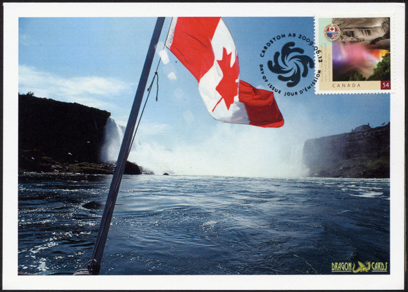 Sc. 2332 (Canada) Boundary Waters on a 5"x7" Dragon Card showing a photo of the Canadian flag flying from the bow of a boat with the Niagara River and the Falls in the background. First Day of Issue hand cancel. Great for a Niagara Falls-on-stamps collection!
