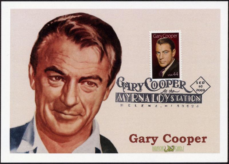 Sc. 4421 Gary Cooper on a 5"x7" Dragon Card with a portrait of an older Cooper. Gary Cooper First Day of Sale hand cancel at the Myrna Loy Station in Helena, MT - his (and her) hometown. (They were both in 1925's "Ben-Hur" as extras, by the way.). Great for a movies- or entertainment-on-stamps collection!