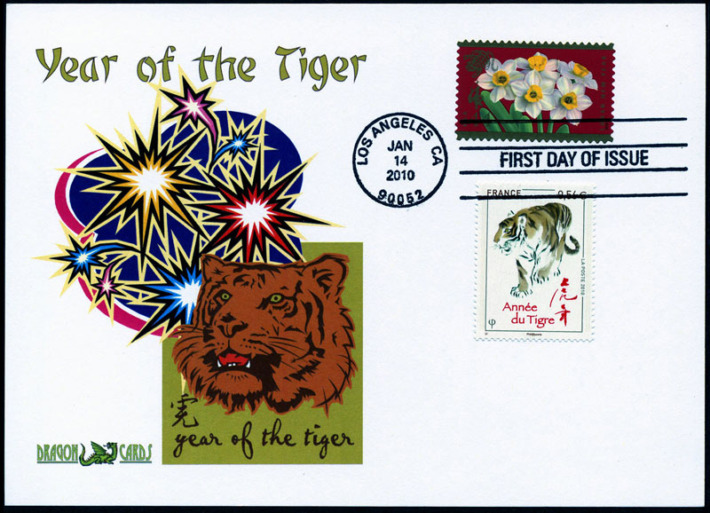 Sc. 4435 Year of the Tiger on a 5"x7" Dragon Card showing a Year of the Tiger icon and fireworks. First Day of Issue hand cancel ties France’s 2010 stamp . Great for a cats-, animals- or Lunar Holidays-on-stamps collection!