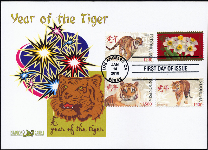 Sc. 4435 Year of the Tiger on a 5"x7" Dragon Card showing a Year of the Tiger icon and fireworks. First Day of Issue hand cancel ties Indonesia’s 2010 stamps. Great for a cats-, animals- or Lunar Holidays-on-stamps collection!